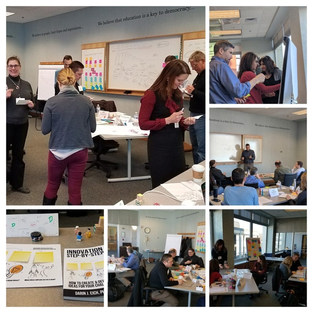 Do you need to lead your team or groups of customers or stakeholders through the innovation process? Do you want to create a new innovation program or even product development/marketing ideation service? You can learn to facilitate a simple process for innovation with new tools, techniques and activities. Our design thinking and innovation trainer or facilitator training can be done in person at your site or online. Our online Innovation Facilitator Design Thinking Train the Trainer program combines over 20 hours of online training with 2 one-on-one coaching or consultation sessions to give leaders a deeper dive into fostering innovation. Bring our tools and activities to your organization to start an innovation process that improves product development, recruiting, communication, marketing and more. We can design and facilitate an innovation workshop for you or train you to design and facilitate your own innovative session yourself.